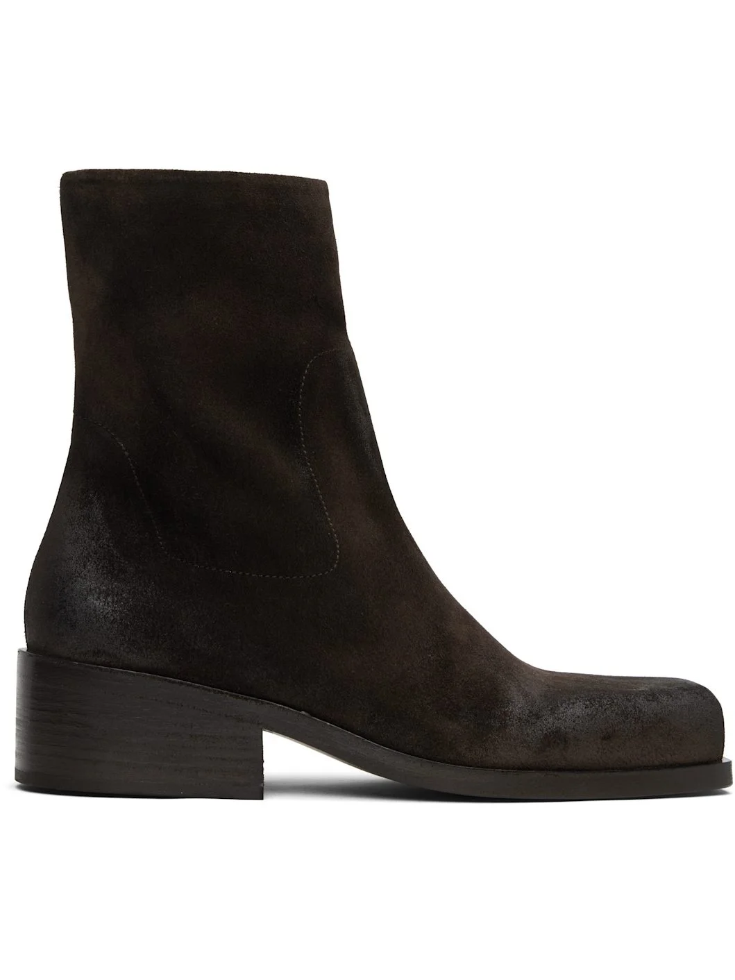 Ankle-high calfskin suede boots. Subtle distressing throughout. · Square toe · Zip closure at inner side · Suede and grained leather lining · Stacked leather block heel · Leather sole with rubber heel · Heel: H2.25" Supplier color: Dark brown Upper: calfskin. Sole: rubber. Made in Italy 252349M223004