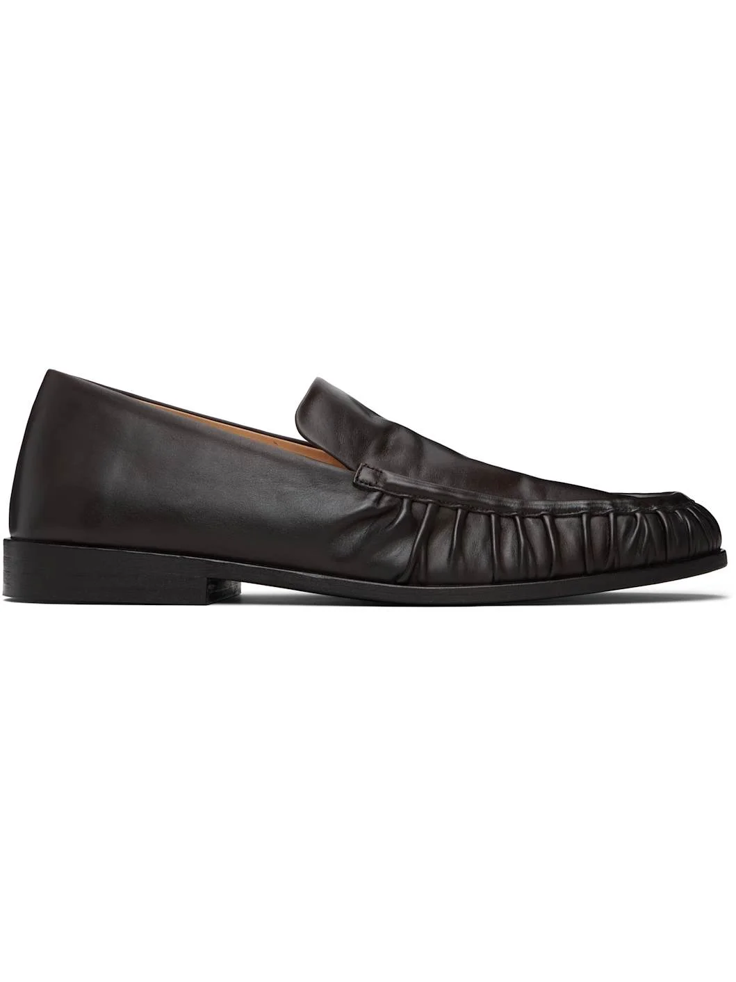 Buffed leather loafers. · Gathering at moc toe · Buffed leather and suede lining · Leather block heel with rubber injection · Leather sole Supplier color: Dark Brown Leather. Made in Italy 261349M231004