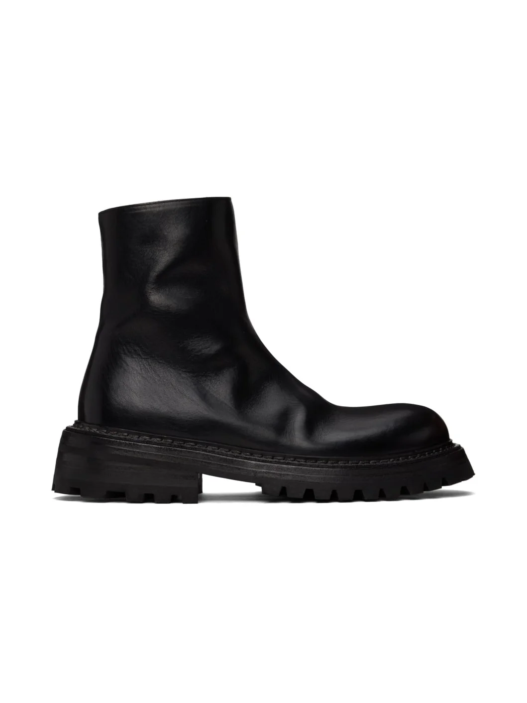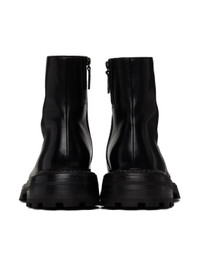 Handcrafted ankle-high grained leather boots in black. · Elasticized gusset and zip closure at inner side · Logo embossed at padded leather footbed · Suede and nubuck lining · Stacked leather midsole and heel · Lugged rubber sole · Heel: H2" Supplier color: Black Upper: leather. Soler: leather, rubber. Made in Italy 242349M223006