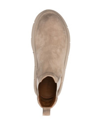 Intagliata suede Chelsea boots light beige calf suede pull-tab at the heel pull-on style elasticated ankles ridged rubber sole round toe Made in Italy Composition Lining: Calf Leather 100% Outer: Calf Suede 100% Sole: Rubber 100% SIZE & FIT Measurement CIRCUMFERENCE 9.05 in(23 cm) HEEL 1.18 in(3 cm) HEIGHT 4.33 in(11 cm) Sole height 1.18 in(3 cm)