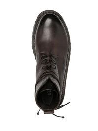 Carrucola leather combat boots dark-brown leather pull-tab at the heel round toe front lace-up fastening ankle-length ridged rubber sole Made in Italy Composition Outer: Leather 100% Lining: Leather 100% Sole: Rubber 100% SIZE & FIT FittingInformation This piece fits large – take one size down Measurement HEEL 1.96 in(5 cm) Sole height 0.98 in(2.5 cm) HEIGHT 6.29 in(16 cm)
