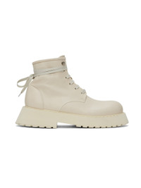 Ankle-high buffed leather boots in off-white. · Wraparound lace-up closure · Suede lining · Treaded microporous platform sole · Platform: H1.5" · Heel: H2" Supplier color: Ivory Upper: leather. Sole: rubber. Made in Italy 241349M255010