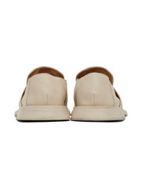 Grained leather loafers in off-white. · Gathering at round moc toe · Strap at vamp · Concealed elasticized gussets at collar · Buffed calfskin lining in beige · Scalloped detailing at welt · Stacked leather midsole · Leather outsole with rubber injection at heel Supplier color: Ivory Upper: leather. Sole: leather, rubber. Made in Italy 231349M231012