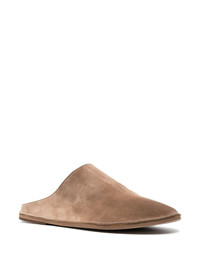 Strasacco suede mules chocolate brown calf suede round toe flat rubber sole Made in Italy Composition Lining: Calf Leather 100% Sole: Calf Leather 100% Outer: Calf Suede 100% SIZE & FIT Measurement HEEL 0.39 in(1 cm)
