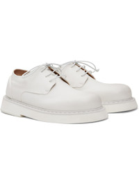 Pebble-grained leather derbys in white. · Sacchetto construction · Lace-up closure · Padded trim at heel counter · Buffed leather and nubuck lining · Foam rubber sole Available exclusively at SSENSE. Supplier color: Bianco optical Upper: leather. Sole: rubber. Made in Italy 251349M225010