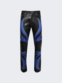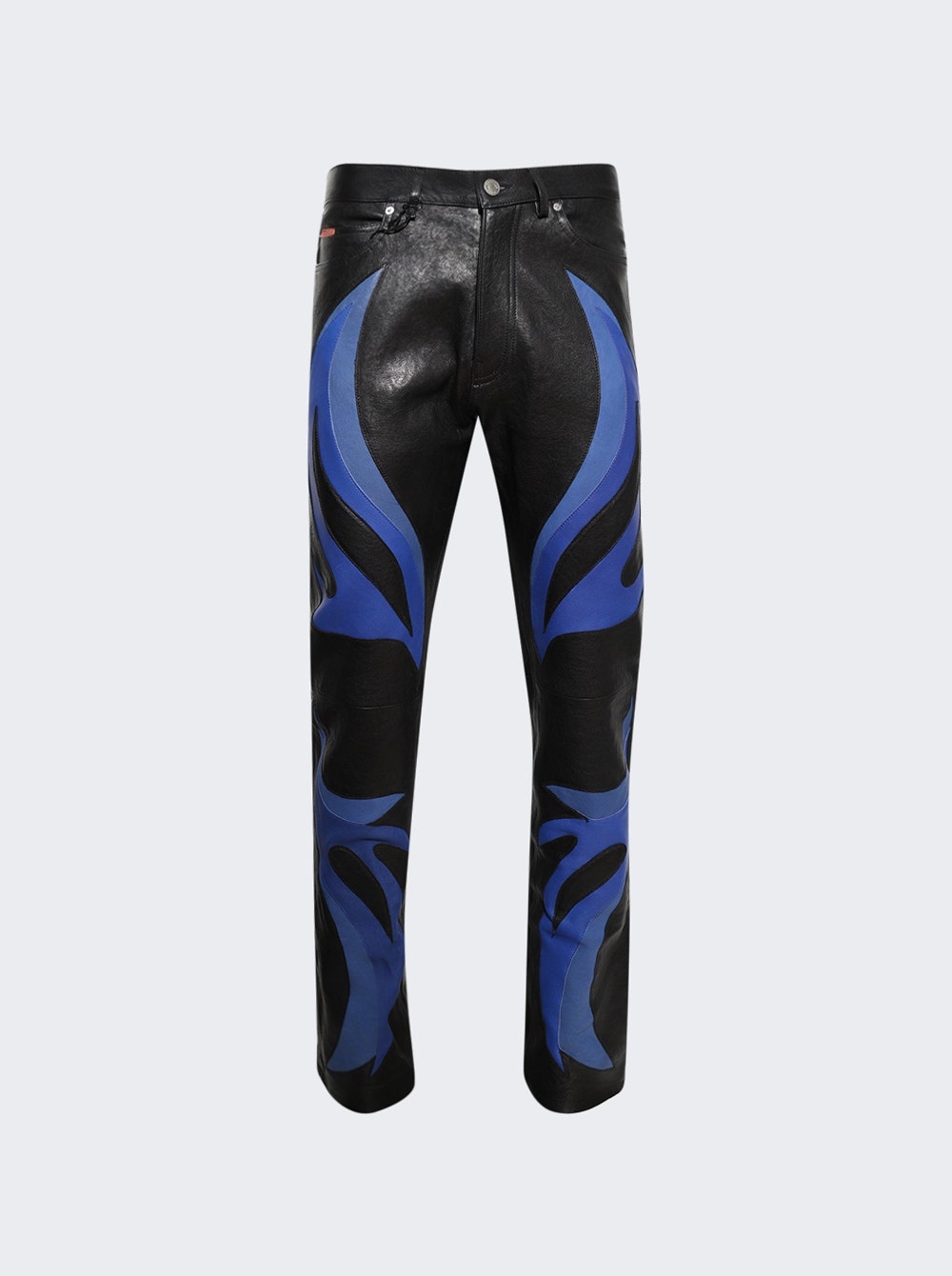 Details - Paneled black and blue leather trousers - Contrast graphic applique embellishment throughout - Belt loops, back logo patch, front button & concealed zip fly closure - Tapered leg, slim fit - Model is 6'1"/185cm and is wearing a size M - 100% Calf Leather Brand Style: 547LF06013 Designer/Brand: MARTINE ROSE