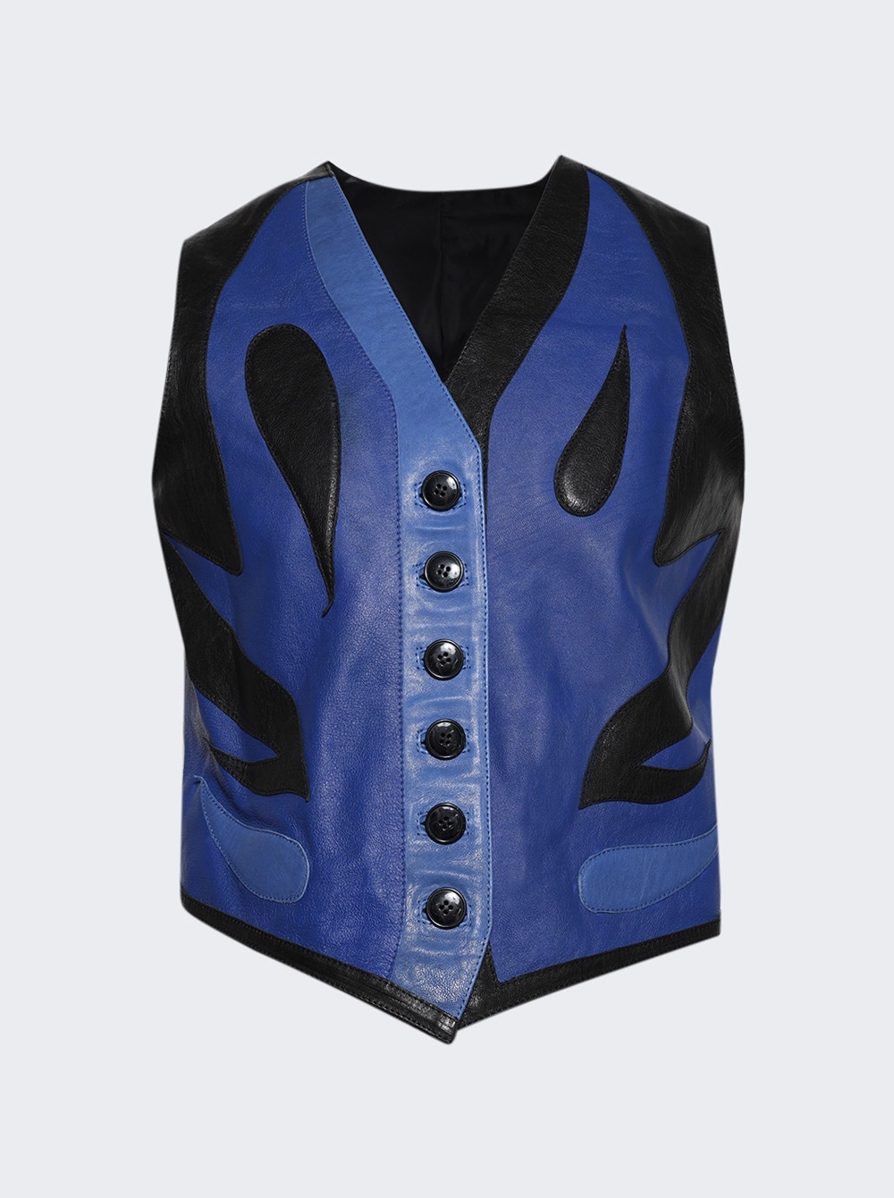 Details - Black and blue paneled leather waistcoat - Button closure - Model is 6'1"/185cm and is wearing a size M - 100% Calf Leather Brand Style: 550LF06013 Designer/Brand: MARTINE ROSE