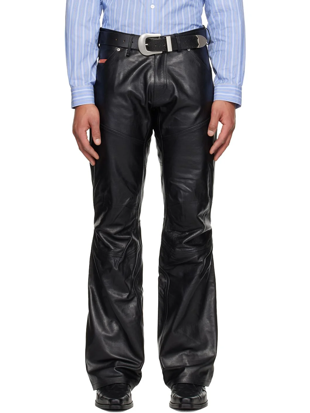 Grained calfskin pants. · Belt loops · Five-pocket styling · Keyring at zip fly · Logo patch at coin pocket and back waistband · Partial satin lining Supplier color: Black Body: 100% calfskin. Lining: 57% viscose, 43% polyester. Made in Italy 252892M189002