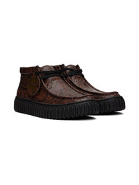 Ankle-high snake-embossed leather boots in brown. · Moc toe · Logo tag at lace-up closure · Removable moulded footbed · Grained sheepskin lining · Textured rubber midsole · Treaded rubber sole Part of the Martine Rose x Clarks collaboration. Supplier color: Brown