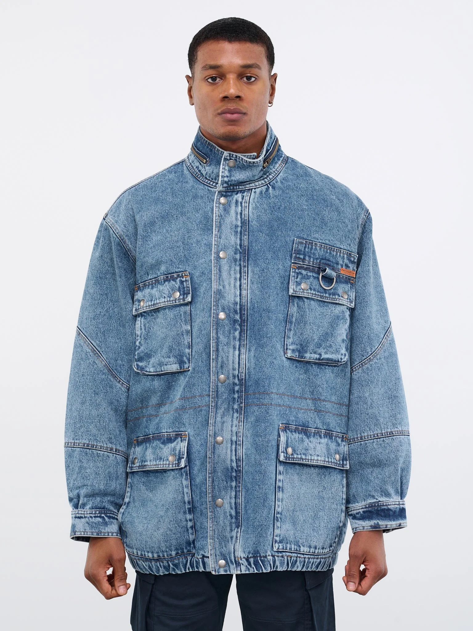 MARTINE ROSE jacket in blue, oversized parka design, washed denim, stand collar, zip opening, flap pockets, D-ring detail, press stud closure & cuffs, denim topstitching, elastic waist, relaxed fit. Standard Sizing 100% Cotton Model is 6’2.5” wearing size M. Shoulders: 20” Chest: 40” Waist: 32”
