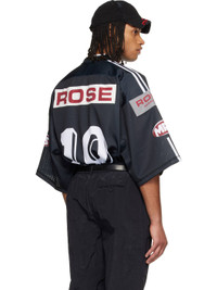 Mesh T-shirt. · Logo patches, printed logos, and text throughout · Rib-knit V-neck · Check pattern at front · Dropped shoulders · Stripes at sleeves Supplier color: Black/Grey 100% polyester. Made in Portugal 252892M213007