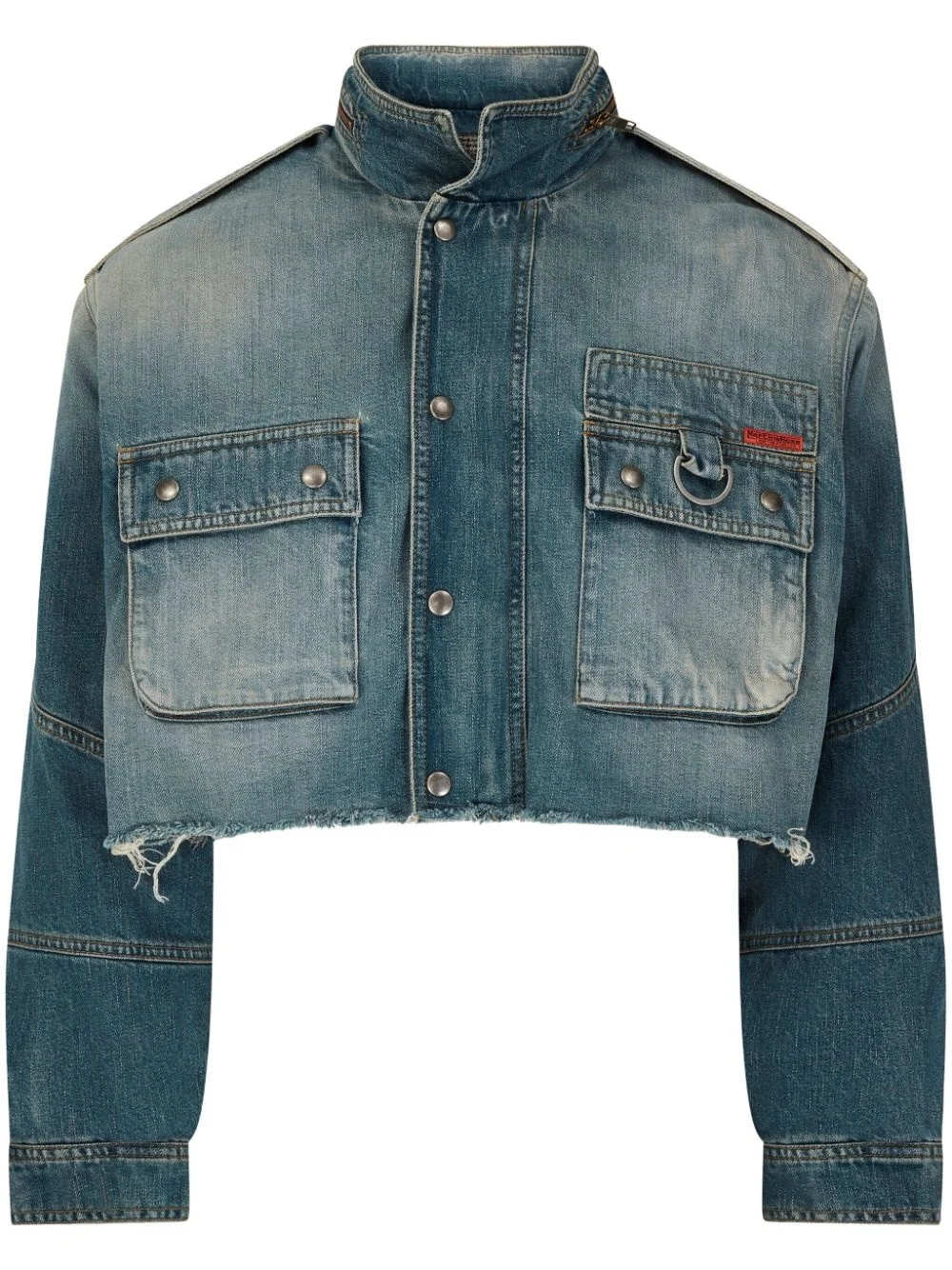 logo-patch denim cropped jacket Highlights - Blue - Cotton - Washed denim - Faded effect - Logo patch at the chest - Front button fastening - Two chest flap pockets - Long sleeves - Straight hem - Cropped Imported Composition Cotton 100%