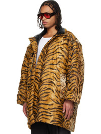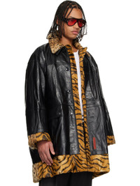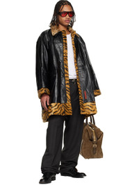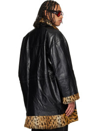 Reversible grained calfskin coat. Leopard-pattern printed faux-fur trim throughout. Reverse in tan faux-fur. Leopard pattern and stripes printed throughout · Spread collar · Zip closure with button placket · Flap pockets and logo patch at front · Locker loop at back collar · Welt pockets at interior Supplier color: Black Body: 100% calfskin. Trim: 67% cotton, 33% viscose. Lining: 100% polyester. Made in Italy 252892M181001
