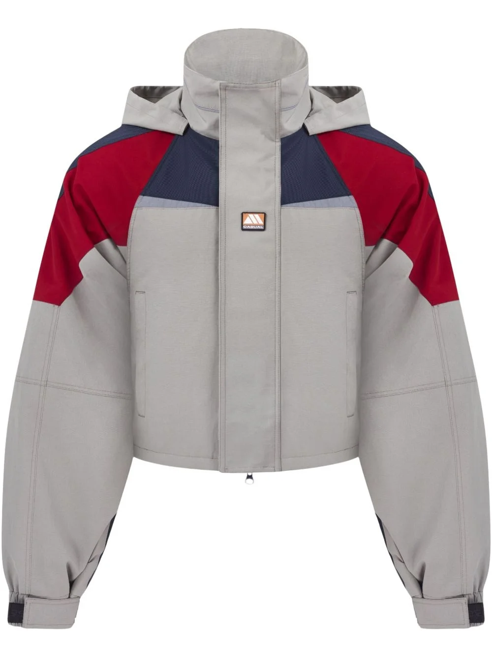 Shrunken sports jacket Highlights - Light grey - Color-block design - High neck - Hooded - Front zip fastening - Ribbed cuffs - Oversized silhouette - Contrasting panels Imported Composition Polyamide 100%, Polyester 82%, Cotton 18%