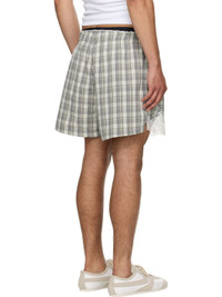 Cotton seersucker shorts. Check pattern throughout. · Picot trim at elasticized waistband · Two-pocket styling · Bow accent at front · Reflective logo patch at button fly · Scalloped lace trim at vented cuffs Part of the exclusive SSENSE HEAT capsule. Supplier color: Grey lime check Body: 100% cotton. Trim: 100% polyester. Made in Bulgaria 252892M193001