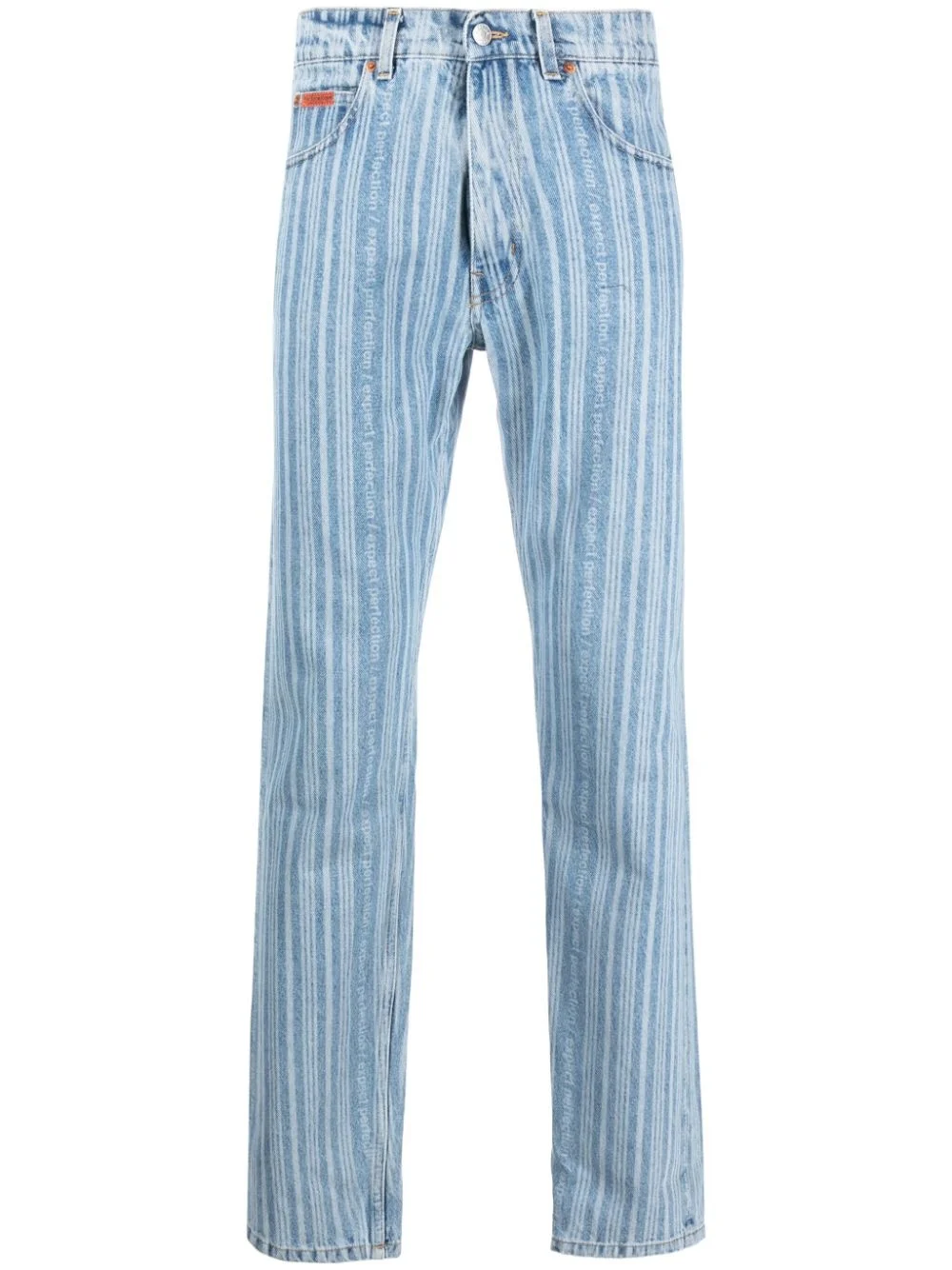 striped straight-leg jeans Martine Rose denim pieces are enhanced with rustic influences for a lived-in appeal. These jeans boast an all-over pinstripe print, while the bright orange logo tab at the front pocket lends a signature touch. Highlights - Light-blue wash - Cotton denim - Pinstripe print - Straight leg - Logo patch to the rear - Mid-rise - Belt loops - Front button and zip fastening - Classic five pockets Made in Italy Composition Cotton 100% SIZE & FIT Model measurements Height 6 ft 2 in(1.88 m) Bust/Chest 35.03 in(89 cm) Hips 35.82 in(91 cm) Waist 27.95 in(71 cm) FittingInformation Designed with a straight leg, these jeans allow for an unrestricted and comfortable fit over the leg Sturdy and hard-wearing, this denim piece offers no stretch This piece fits true to size – take your usual size Washing instructions Machine Wash