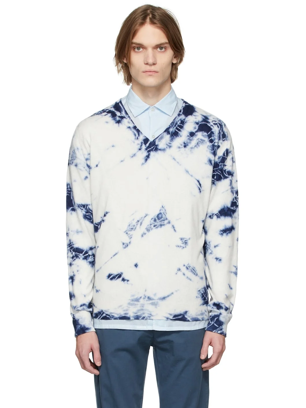 Long sleeve brushed knit cashmere sweater in off-white featuring tie-dye pattern in tones of blue. Rib knit V-neck collar, cuffs, and hem. Each item is unique. Please note that coloration may vary. Supplier color: Blue 100% cashmere. Made in Italy 221846M206001