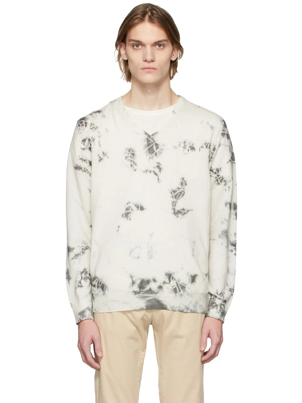 Long sleeve brushed knit cashmere sweater in off-white featuring tie-dye pattern in tones of grey. Rib knit V-neck collar, cuffs, and hem. Each item is unique. Please note that coloration may vary. Supplier color: Military 100% cashmere. Made in Italy 221846M206000