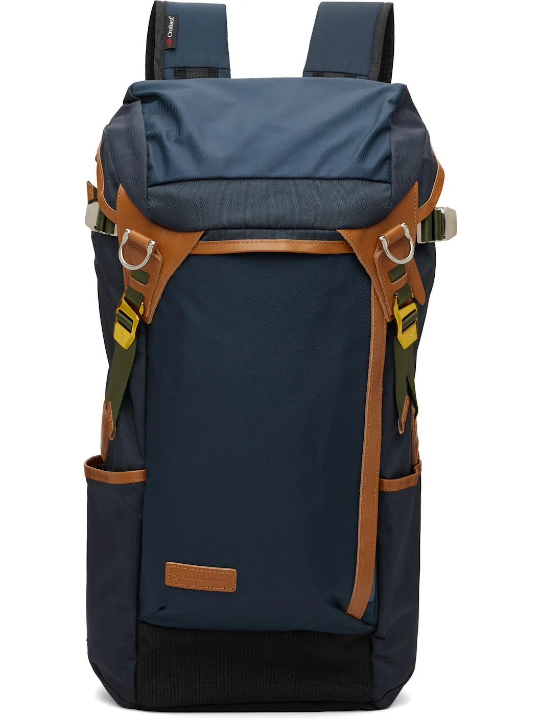 Water-repellent MASTERTEX-07 CORDURA BALLISTIC® nylon canvas backpack. · Buffed leather trim throughout · Carry handle at top · Adjustable padded Outlast® shoulder straps · D-ring and loops at shoulder straps · Zip pocket and logo patch at face · Cinch tabs and D-rings at face · Patch pocket and cinch strap at sides · Zip opening at padded mesh back face · Zip laptop compartment at back face · Concealed zip pocket at hook-eye flap · Bungee-style drawstring closure · Zip pockets at interior · Padded laptop compartment · Full canvas lining · H21" x W11" x D6.75" / 20 L Supplier color: Navy Body: 100% nylon. Trim: 100% leather. Lining: 100% nylon. Made in Japan 252401M166010