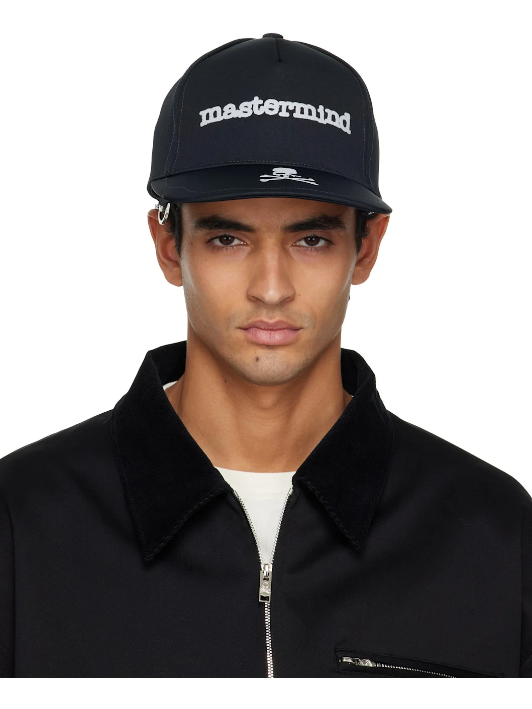 Plain-woven cap. · Logo printed at face and curved brim · D-ring at brim · Cinch fastening · Poplin lining · Hand-embroidered contrast stitching in gray Supplier color: Black 100% polyester. Made in Japan 252563M139001