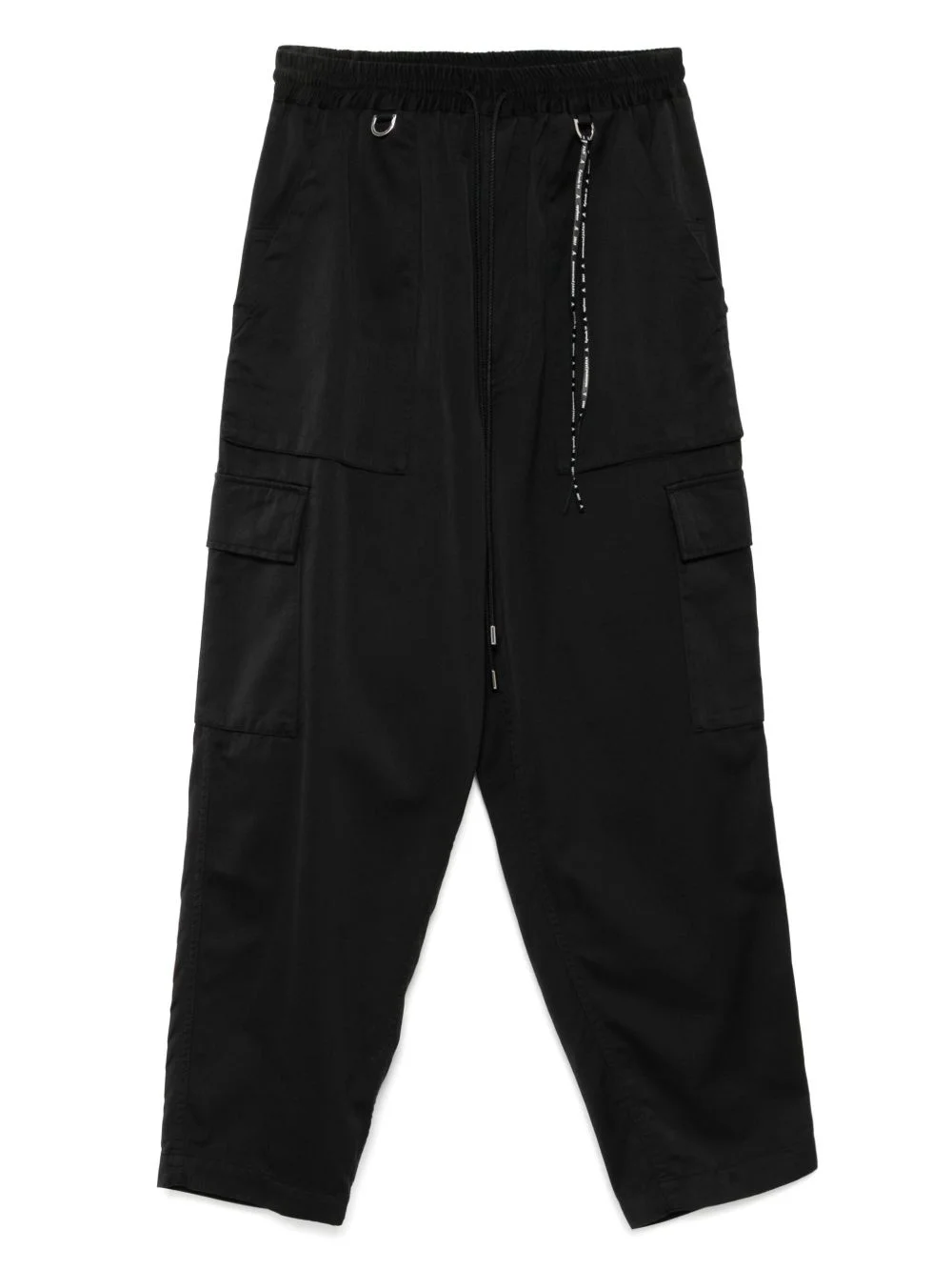 cargo trousers Highlights - Black - Elasticated drawstring waistband - Two side slash pockets - Two side cargo pockets - Two rear flap pockets Imported Composition Cotton 84%, Polyester 16% SIZE & FIT Model measurements Height 6 ft 2 in(1.88 m) Bust/Chest 34.25 in(87 cm) Hips 34.64 in(88 cm) Waist 26.77 in(68 cm) FittingInformation Designed for a tapered leg, offering a loose unrestricted fit over the leg with a closer fit towards the ankle The elasticated waist allows for a comfortable fit Made from a midweight non-stretch fabric