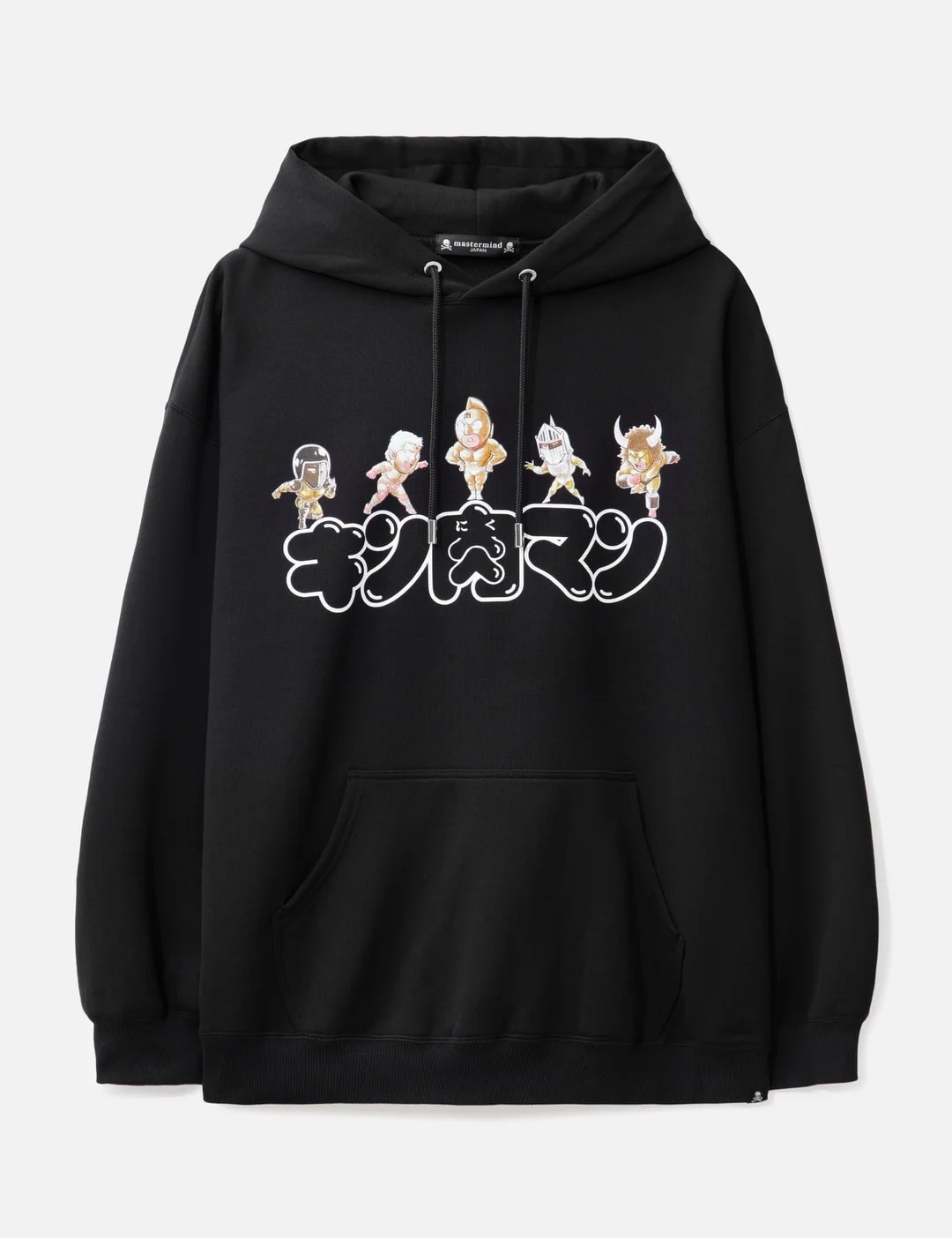 - Mastermind Japan - MASTERMIND JAPAN x Kinnikuman Hoodie - MASTERMIND JAPAN x Kinnikuman collaboration - Drawstring hood - Long sleeves - Graphic printed at front and back - Kangaroo pocket - Ribbed cuffs and hem - Color: Black - Material: 100% Cotton - See more Hoodies and Clothing SIZING - Model wears size M - Model measures: Height 189cm, Chest 31.5"/80cm, Waist 27”/69cm, Hip 34.3’’/87cm
