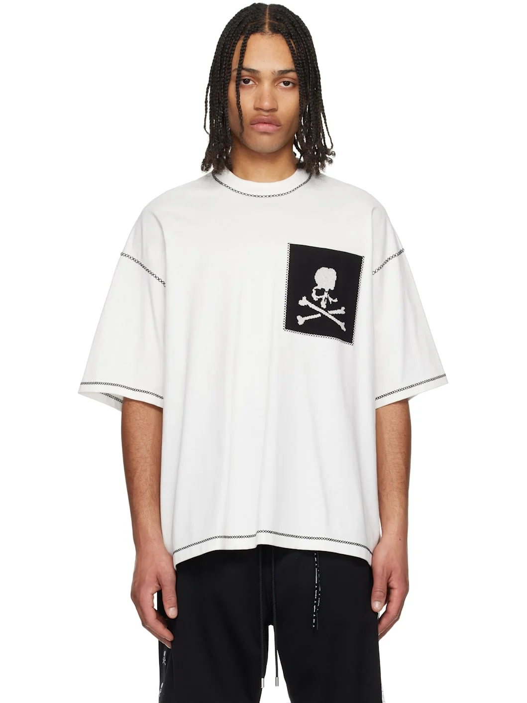 Anti-odor cotton jersey T-shirt. Cross-stitch detailing throughout. · Boxy-fit · Rib-knit crewneck · Intarsia logo at patch pocket · Logo patch at front and back hem · Dropped shoulders · Detachable logo-printed trim at interior · Contrast stitching in black Supplier color: White 100% cotton. Made in Japan 251563M213014
