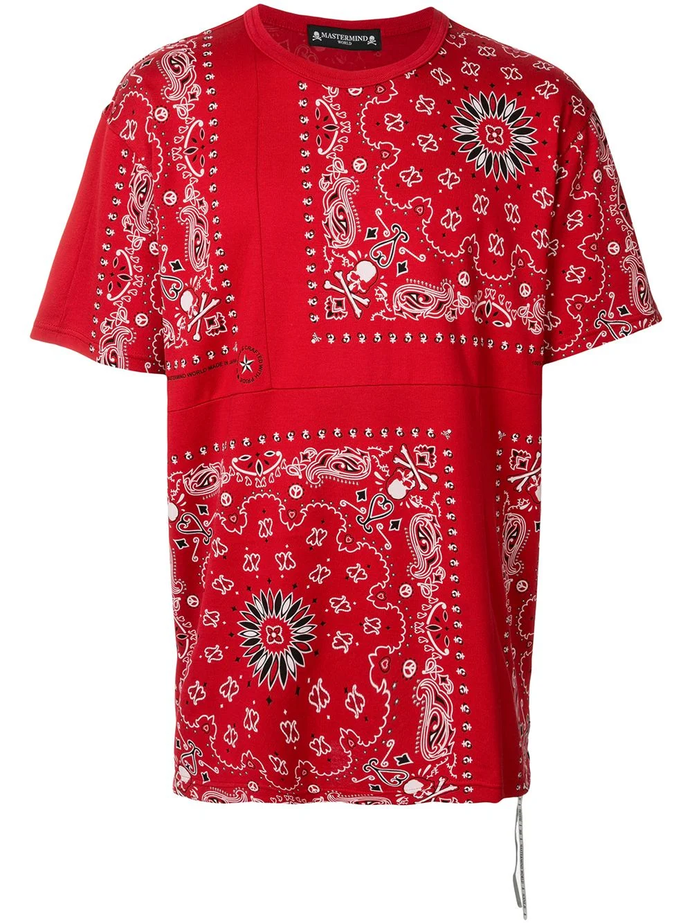 crew neck bandana print T-shirt Red cotton crew neck bandana print T-shirt from MASTERMIND WORLD featuring a crew neck, short sleeves, a straight hem and a boxy fit. Imported Composition Cotton 100% SIZE & FIT Model measurements Height 6 ft 0 in(1.84 m) Bust/Chest 35.43 in(90 cm) Hips 35.82 in(91 cm) Waist 28.74 in(73 cm) FittingInformation This piece fits true to size. We recommend you get your regular size Cut for a loose fit Made with a mid-weight fabric Washing instructions Machine Wash