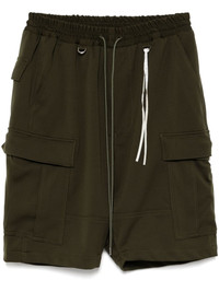 drawstring cargo shorts Highlights - Olive green - Elasticated drawstring waistband - Two side inset pockets - Panelled design Imported Composition Polyester 100% SIZE & FIT Model measurements Height 6 ft 2 in(1.87 m) Bust/Chest 33.07 in(84 cm) Hips 35.43 in(90 cm) Waist 26.77 in(68 cm) FittingInformation Designed for relaxed fit, offering a comfortable loose fit over the leg The elasticated waist allows for a comfortable fit Made from a midweight non-stretch fabric
