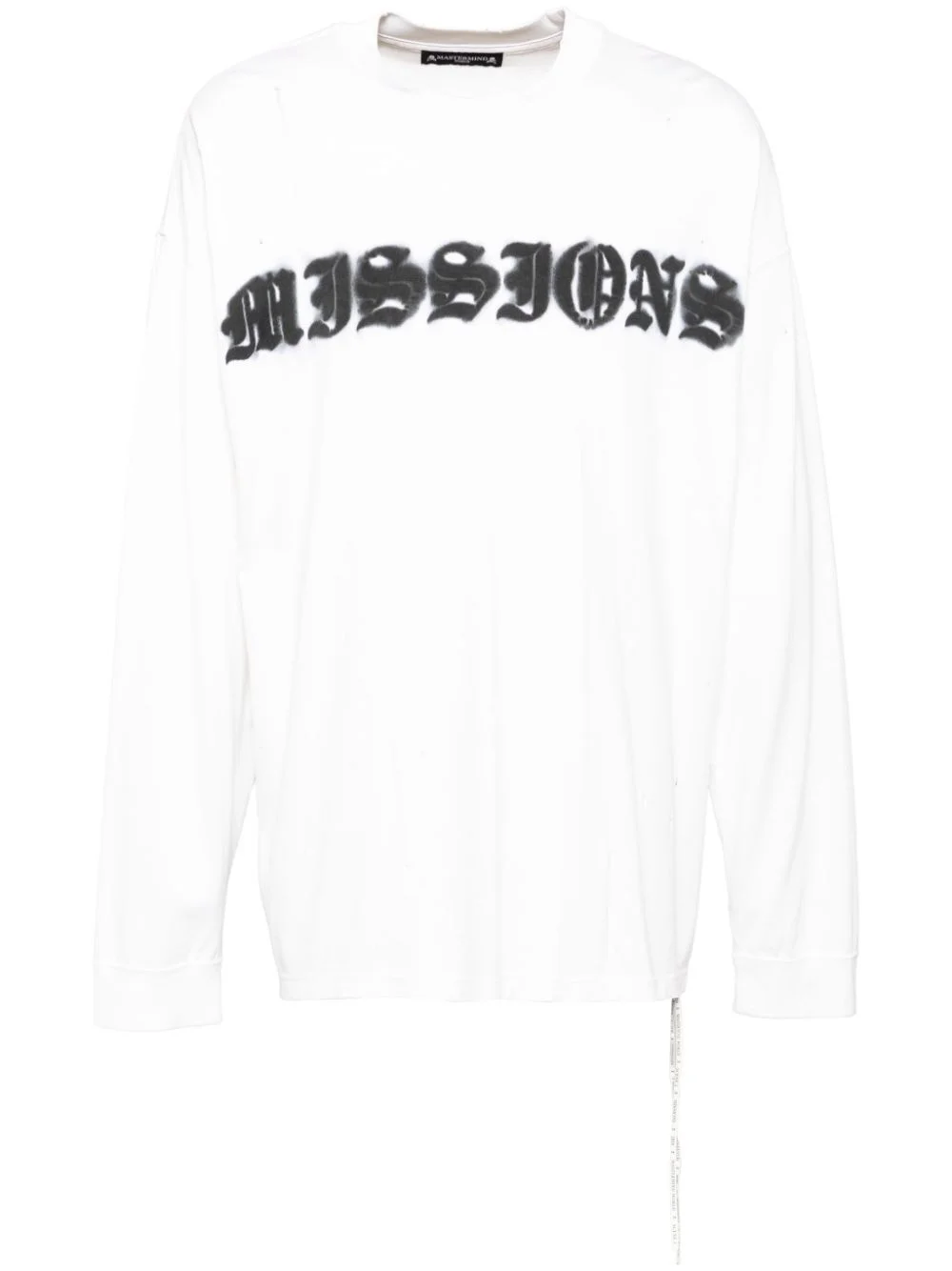 logo print long-sleeves T-shirt Highlights - White - Crew neck - Distressed effect - Drop shoulder - Ribbed cuffs Imported Composition Cotton 100% SIZE & FIT Model measurements Height 6 ft 2 in(1.88 m) Bust/Chest 34.25 in(87 cm) Hips 34.64 in(88 cm) Waist 26.77 in(68 cm) FittingInformation Designed to be unstructured, offering a loose fit throughout Made from a lightweight non-stretch fabric, this piece offers minimal elasticity when worn