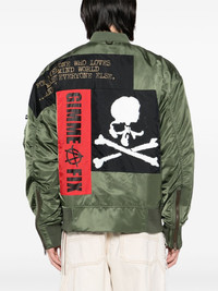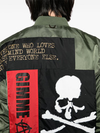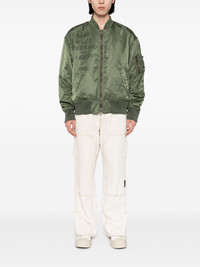 logo-printed bomber jacket Highlights - Khaki green - Front two-way zip fastening - Slogan print to the front - Logo print to the rear - Padded design - Two front flap pockets - Long sleeves - Ribbed cuffs and hem - Straight hem - Silk lining Imported Composition Outer: Nylon 100% Lining: Silk 100% SIZE & FIT Model measurements Height 6 ft 2 in(1.87 m) Bust/Chest 33.07 in(84 cm) Hips 35.43 in(90 cm) Waist 26.77 in(68 cm) FittingInformation Designed for an oversized fit, offering additional room throughout The ribbed hem offers a close, comfortable fit Made from a padded non-stretch fabric, giving it no natural elasticity