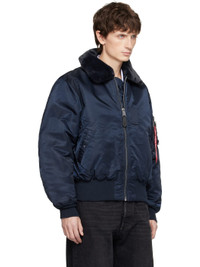 Reversible padded taffeta bomber jacket. Reverse in navy taffeta. · Detachable faux-fur trim at spread collar · Zip closure · Welt pockets at waist · Rib-knit hem and cuffs · Utility pocket with detachable logo flag at sleeve · D-ring at sleeve and back collar · Faux-fur logo at back · Reflective logo bonded at interior · Welt pockets at interior · Logo-engraved silver-toned hardware Part of the Mastermind World x Alpha Industries collaboration. Supplier color: Navy Body: 100% nylon. Trim 1: 100% polyester. Trim 2: 100% polyester. Trim 3: 100% polyester. Trim 4: 100% polyester. Trim 5: 100% leather. Fill: 100% polyester. Lining: 100% nylon. Pocket lining: 80% polyester, 20% cotton. Made in China 261968M175000