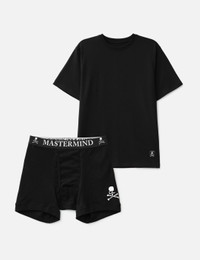 - Mastermind World - T-shirt & Trunk Set - Set of 2 - Made of Ag Fresh fabric - High antibacterial and deodorizing effect - Top : - Crewneck - Short sleeve - Woven logo - Skull logo print on yoke - Bottom: - Branded elastic waistband - Skull logo print on left leg - Zipper carrying bag included - Made in Japan - Color: Black - Material: Top Body: 100% Cotton; Bottom Body: 100% Cotton; Bottom Waistband: 65% Nylon, 25% Polyester, 10% Polyurethane - See more Underwear and Accessories - Model wears size M - Model measures: Height 186cm, Chest 34”/86cm, Waist 28”/71cm, Hip 36”/91cm - Vendor Code: MW25S15-TR003