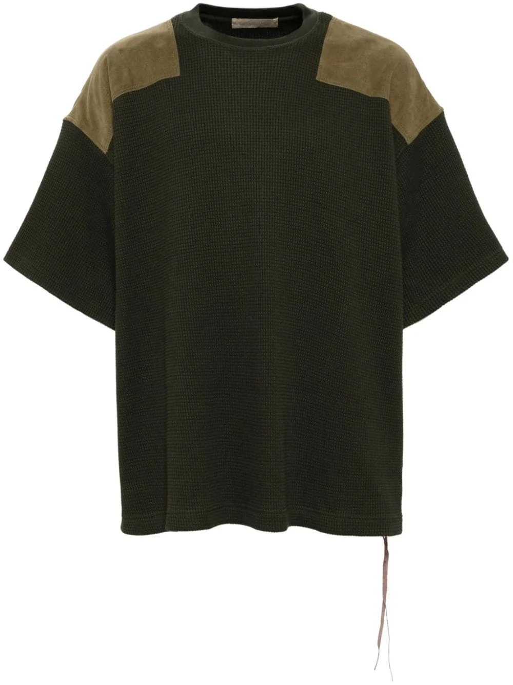 waffle T-shirt Highlights - Olive green - Cotton blend - Waffle effect - Panelled design - Skull patch detail - Crew neck - Short sleeves - Drop shoulder Imported Composition Outer: Cotton 100% Polyester 100% SIZE & FIT Model measurements Height 6 ft 2 in(1.88 m) Bust/Chest 34.25 in(87 cm) Hips 34.64 in(88 cm) Waist 26.77 in(68 cm) FittingInformation Designed to be unstructured, offering a loose fit throughout Made from a midweight non-stretch fabric, this piece offers minimal elasticity when worn