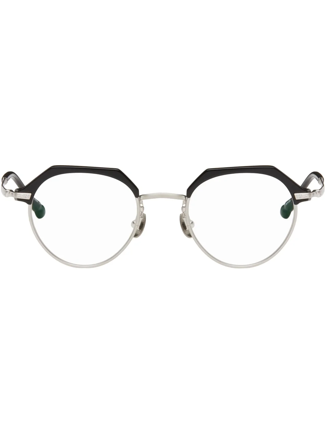 Handcrafted round acetate- and metal-frame optical glasses in black and silver tone. · Engraved detailing throughout · Adjustable metal nose pads · Logo hardware at temple tips · Includes case · Size: 48.21 145 Supplier color: Black Acetate, metal. Made in Japan 251167M133024
