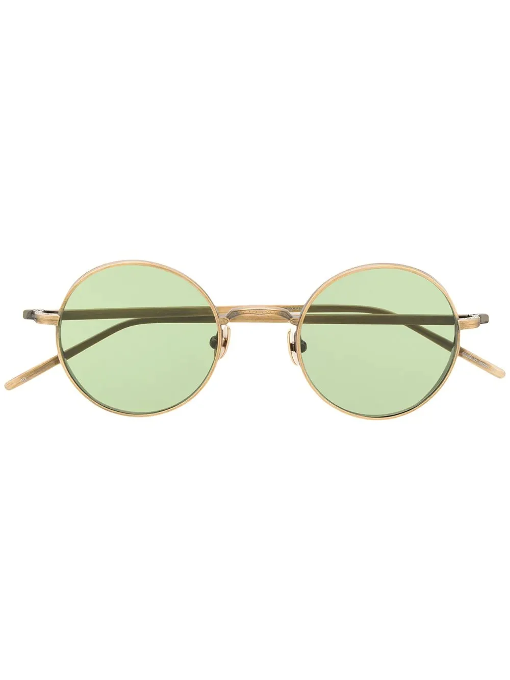 embossed round-frame tinted sunglasses Gold-tone titanium embossed round-frame tinted sunglasses from Matsuda featuring antique effect gold-tone hardware, round frames, an embossed logo, tinted lenses, nose pads and straight arms with angled tips. These glasses can be adapted to fit all types of prescription lenses. This item comes with a protective case. Imported Composition Metal (Other) 100% SIZE & FIT Measurement Arm Length 5.51 in(14 cm) Bridge Width 0.86 in(2.2 cm) Lens Diameter 1.81 in(4.6 cm) Total Width 5.11 in(13 cm) Washing instructions ISAN