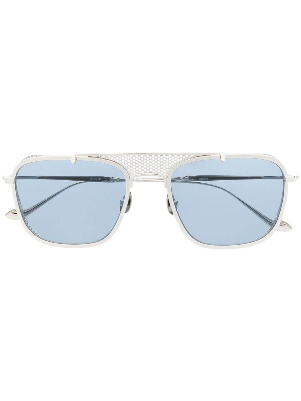 square-frame tinted sunglasses silver-tone titanium silver-tone hardware perforated detailing square frame blue tinted lenses nose pads straight arms curved tips UV-protective lenses These glasses come with a protective case. Imported Composition Titanium 100%