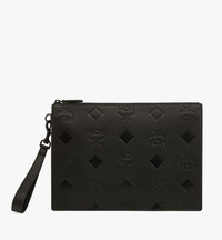 The Maxi monogram magnifies the classic trilogy of letters, laurels, and diamonds on full-grain nappa leather. An accompanying leather wrist strap lends mobile versatility to this standing pouch. - Approximately 2.0 x 11.8 x 8.5 inches - Strap drop: 6.7" - Detachable leather wrist strap - Embossed Maxi Visetos monogram - Zip closure - Interior zip pocket - Full-grain natural nappa leather - Matte black and silver-tone metal hardware - Microfiber lining with suede finish - Made in South Korea Style # MXZDATA06BK001
