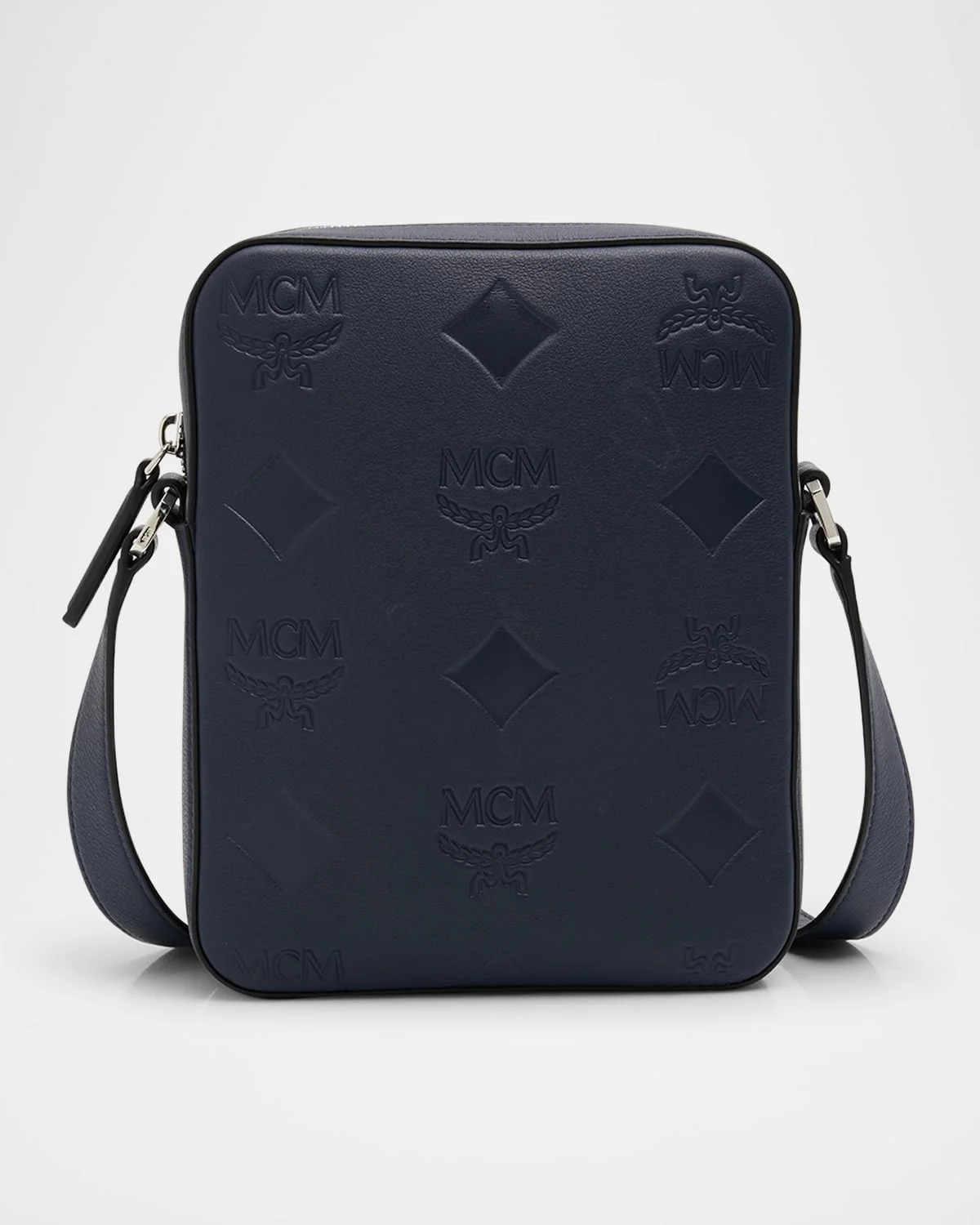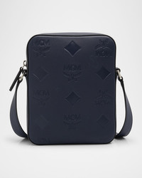 - MCM "Klassik" crossbody bag in monogram-embossed leather - Adjustable shoulder strap - Matte black metal hardware - Inner, one zip pocket - Back, one slip pocket - Zip top closure - Approx. 18"L x 23"H x 5"D - Imported