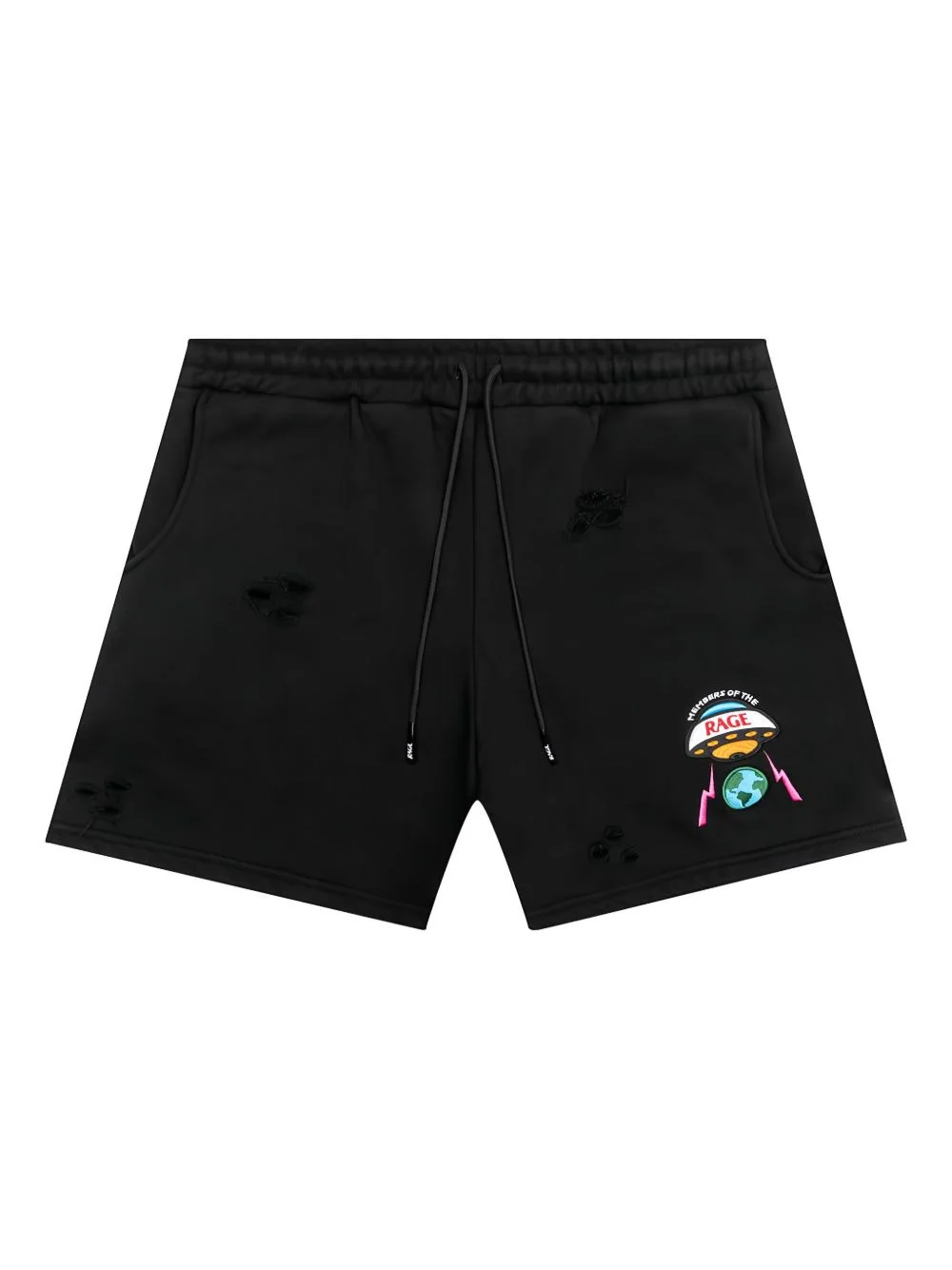 embroidered distressed shorts Highlights - Black - Distressed detailing - Ufo emblem - Earth emblem - Lightning-bolt emblem - Welt pocket Made in United States Composition Cotton 100% Washing instructions Read Manufacturer Guidelines