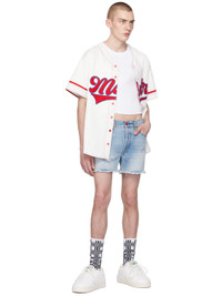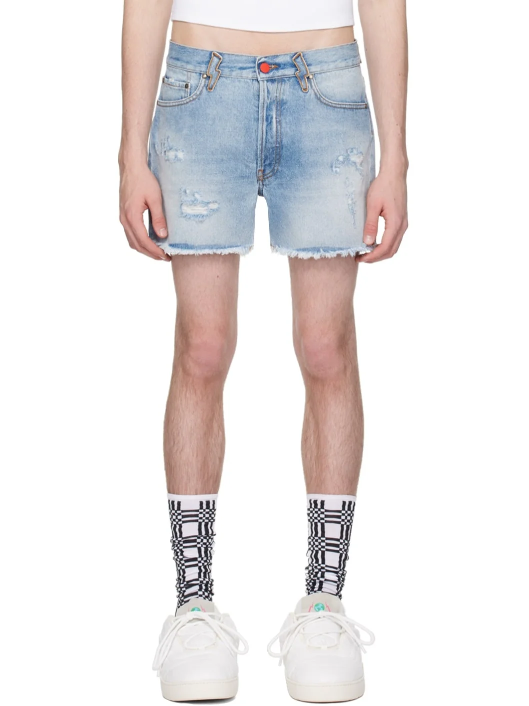 Non-stretch denim shorts. Fading, whiskering, and distressing throughout. · Belt loops · Five-pocket styling · Button-fly · Frayed edges at cuffs · Leather logo patch at back waistband · Contrast stitching in tan Supplier color: Light blue Body: 100% cotton. Lining: 65% polyester, 35% cotton. Made in Italy 241152M193007