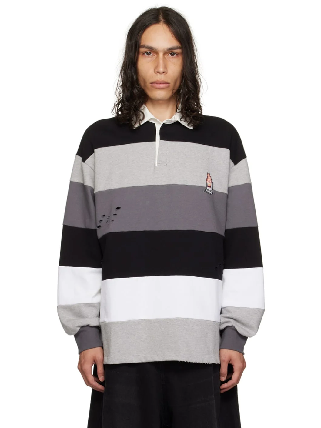 French terry T-shirt. Stripes and distressing throughout. · Paneled construction · Twill spread collar · Concealed three-button placket · Logo graphic patch at chest · Tennis-tail hem · Rib knit cuffs Supplier color: Black Body: 100% cotton. Trim: 98% cotton, 2% elastane. Made in Italy 232152M213007