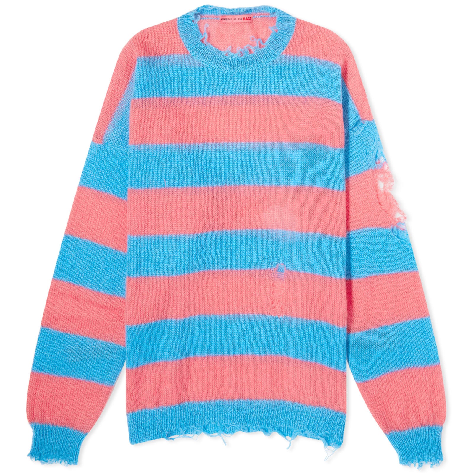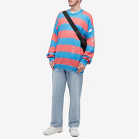 Fresh from the Parisian runway comes Kid Cudi’s new brand Members of the Rage. Inspired by 90s grunge, hip-hop and futuristic elements, this Distressed Striped Knit has been crafted in a soft fabric blend and then distressed for that laidback, almost dystopian vibe. The ‘Georgia Peach’ colour palette adds a juicy summer twist to any wardrobe. - 65% Super Kid Mohair, 32% Polyamide, 18% Merino Wool - Oversized Fit - Distressed Detail - Striped Design