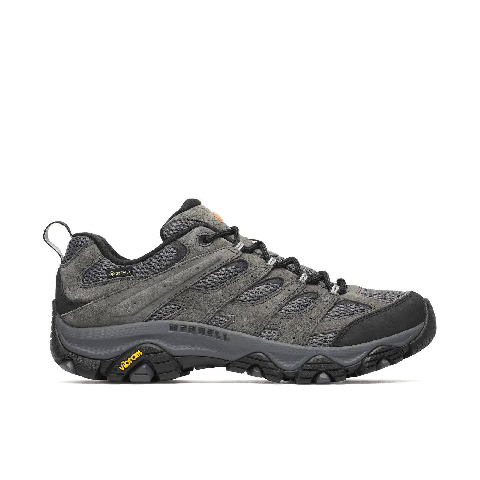 You don't become the #1 hiking boot in the world without knowing a thing or two about the trail. Meet the all-purpose, all-terrain outdoor companion—the Moab 3. Built with GORE-TEX® for top-notch waterproof performance and breathability. No, it’s not just another hiking boot. It’s the next generation of the legendary Moab. FEATURES : • GORE-TEX® waterproof membrane, exceptional breathability and waterproof performance • Pig suede leather and breathable mesh upper • 100% recycled laces and webbing • Bellows tongue keeps out debris • Protective and abrasion resistant rubber heel and toe cap • 100% recycled breathable mesh lining • Exclusive Moab 3 footbed contours to your foot for a more comfortable stride • Molded nylon arch shank • Merrell Air Cushion in the heel absorbs shock and adds stability • Super Rebound Compound midsole provides durable shock absorption to help reduce torque and allow for a smooth transition into the midfoot • Vibram® TC5+ outsole provides exceptional traction for outdoor multi-sport activities, formulated exclusively for Merrell • Wide width construction for a roomier toe box. • Drop: 11.5mm • Lug: 5mm • Half pair weight: 1lbs-0.22oz, 460g
