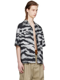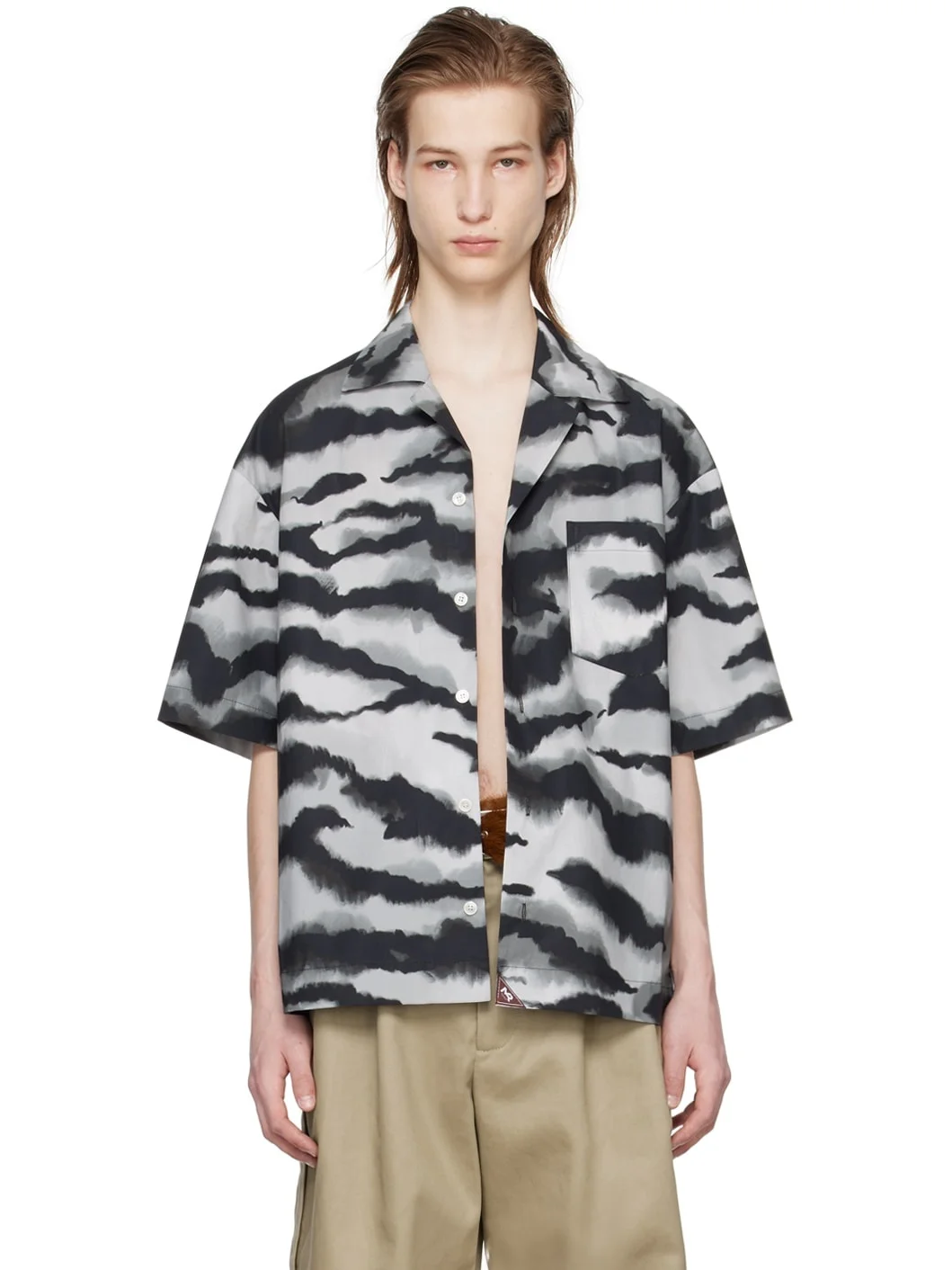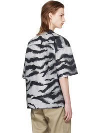Cotton poplin shirt. Graphic pattern printed throughout. · Open spread collar · Button closure · Patch pocket at chest · Logo patch at front hem · Vented side seams · Twin knife pleats at back yoke Supplier color: Tiger grey Body: 100% cotton. Trim: 100% polyester. Made in Italy 241512M192007