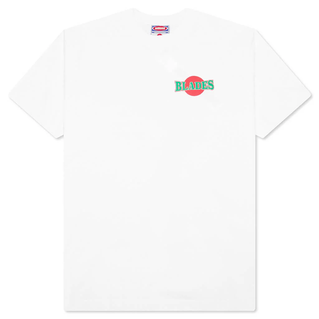 Metalwood Studio presents the Blades Gym T-Shirt in their latest collection. Cut from cotton with a regular fit, this tee features a ribbed crew neckline for all-day comfort. Screen-printed graphics complete the piece with signature Metalwood Studio personality. - 100% Cotton - Regular fit - Crew neckline - Ribbed collar - Screen-printed graphics - Style No: 25FW-03-108-WHT