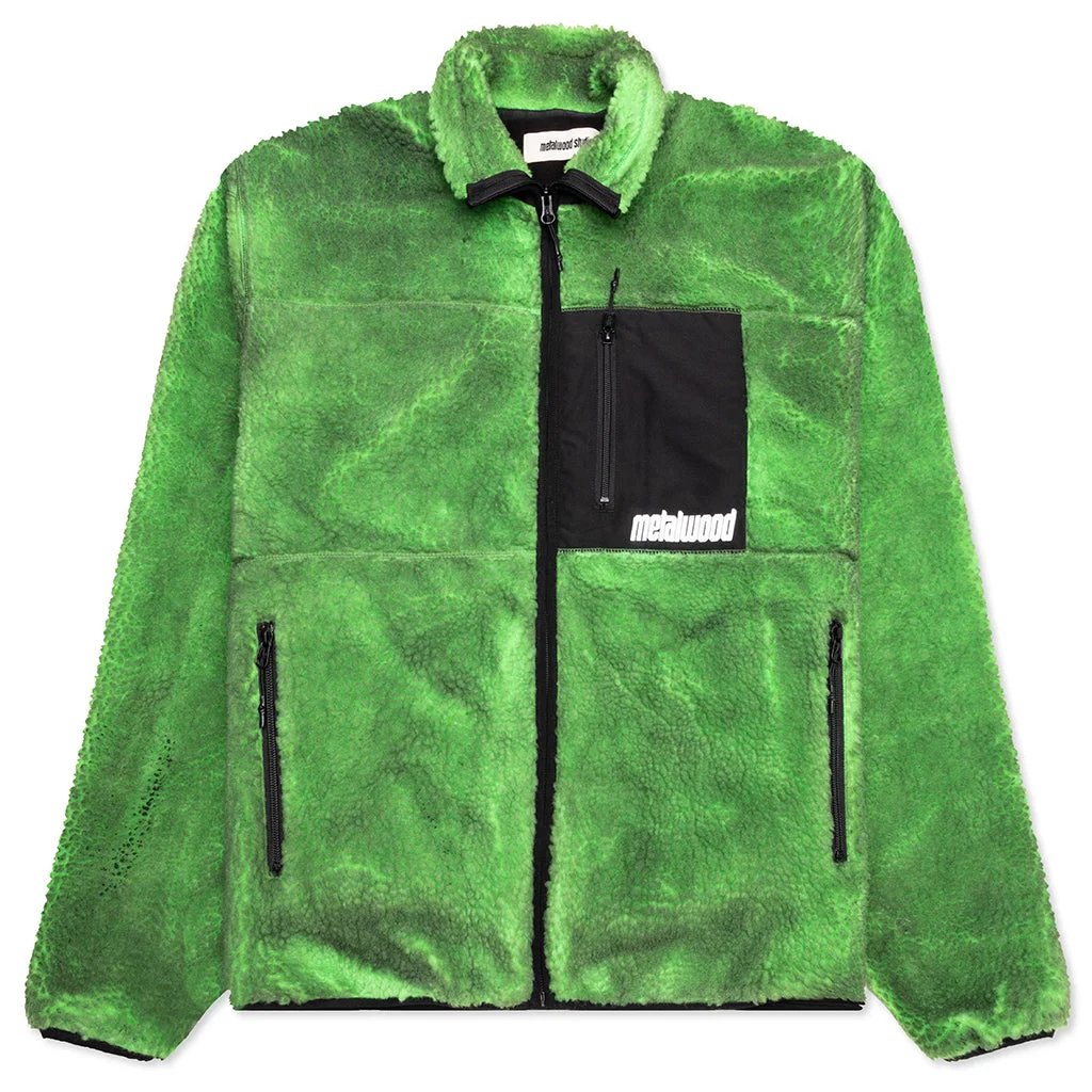 The Painted Sherpa Fleece Jacket from Metalwood Studio is composed of polyester and has a sherpa construction. This garment is highlighted by its neon green color with a painted effect over it, making it more worn-in. A functional zipper at the chest, as well as hand pockets, provide further detail. Some technical details like the zipper closure and the mock neckline complete the look. - 100% Polyester - Zipper closure - Painted effect - Chest zipper pocket - Hand pockets - Mock neckline - Screen-printed branding - Style No: MWS25-05-03-GRN