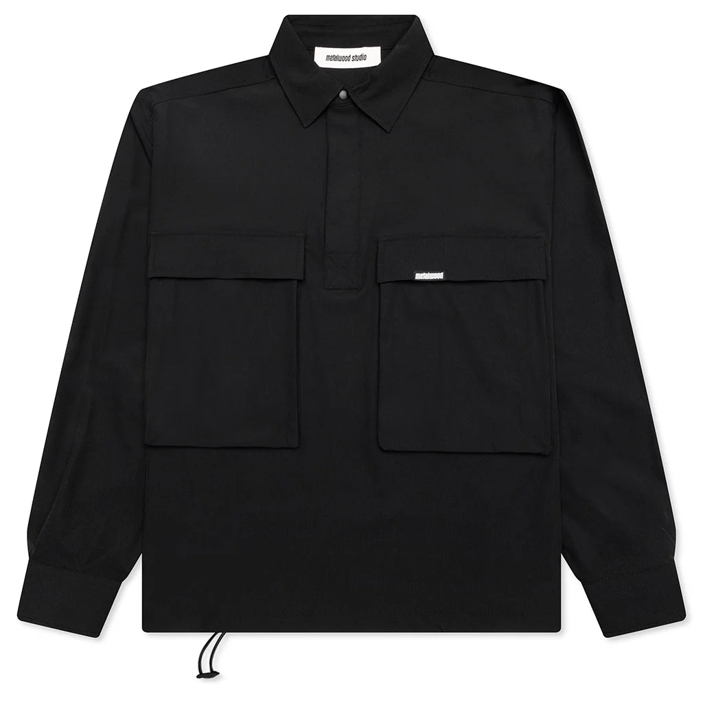 The Ripstop Overshirt from Metalwood Studio is composed of 4-way stretch ripstop polyester. The shirt has a hidden snap button placket paired with the classic collar. Large chest pockets with a snap closure as well as hidden side seam pockets add functionality. Some technical details like the adjustable waist toggles and the pleated elbow complete the design. - 100% Polyester - 4-way stretch ripstop fabric - Hidden snap button placket - Snap button pockets - Side-seam pockets - Classic collar - Adjustable waist toggle - Style No: MWS25-05-04-BLK