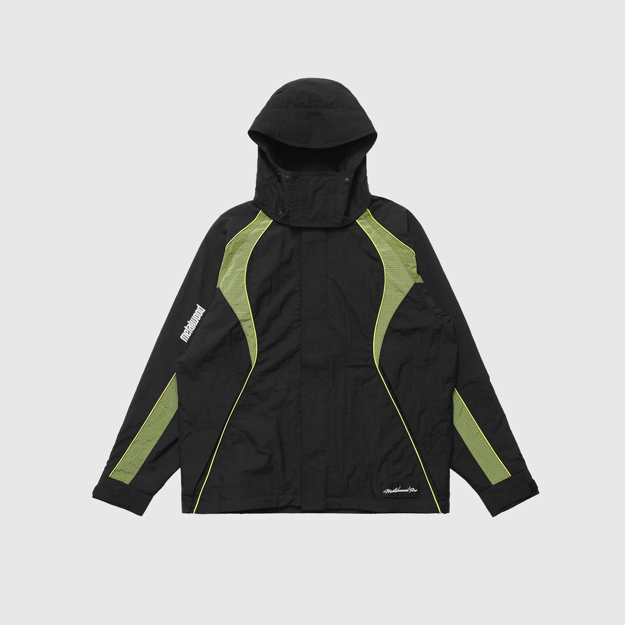 - 25FW-05-108-BLK - Black - 100% Polyester - Panelled construction - Front zipper closure under snap button placket - Removable pullover hood with snap button closure - Two side pockets - Embroidered branding on the sleeve - Emroidered branding on the back - Contrast piping - Woven label