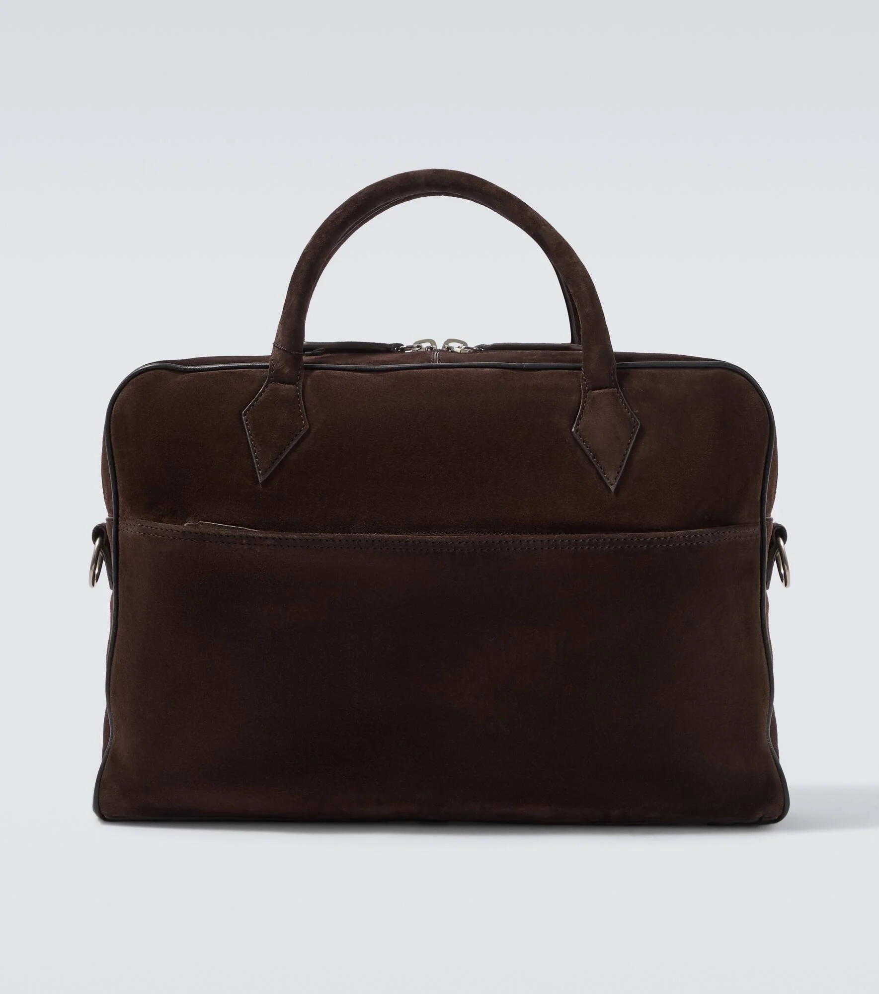 Metier's creations are by your side for every journey. Made in Italy from brown suede, the Closer Slim briefcase comes with two top handles, a detachable shoulder strap, and practical zipped compartments. Product Details - Material: leather (suede) - Lining: suede - Made in Italy - Color: brown - Designer color name: Chocolate - Closure: two-way zipped top - Top handles, Detachable, adjustable shoulder strap - Internal details: single compartment - Zipped front pocket - Includes: dust bag - Hardware color: silver - Item number: P01128976 Size & Fit - Height 27cm-10.5" - Width 39cm-15.5" - Depth 8cm-3" - Length of handles 35cm-14" - Adjustable shoulder strap - Min. length shoulder strap 96cm-38" - Max. length shoulder strap 146cm-57.5"